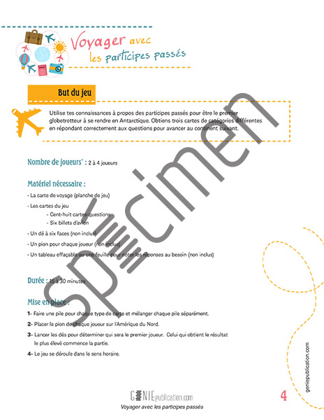 Ce jeu se joue avec un dé, des pions, la planche du jeu et des cartes-questions. L’élève doit répondre à des questions et gagner des cartes pour faire le tour du monde et être le premier à arriver en Antarctique.